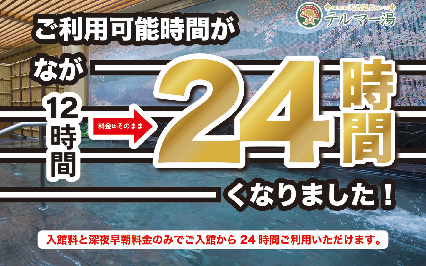 【重要】ご利用可能時間拡大のお知らせ 2025 11/06 ニュース 2025年10月1日 2025年11月6日 10/1(水)朝9時からご利用可能時間が大幅に拡大致します。これまでの12時間から2倍の最大24時間利用可能とさせていただきます。新宿テルマー湯で時間を気にせずのんびりとおくつろぎくださいませ。 ・入館料と深夜早朝料金のみで最大24時間ご利用いただけます。・ご入館から24時間以内に一度ご精算をお願い致します。・24時間を超えた場合は精算金額に当日の入館料を追加で頂戴致します。・ご入館後の一時外出/再入館は不可となっております。・何時からでも入館可能です。 ニュース URLをコピーしました!
