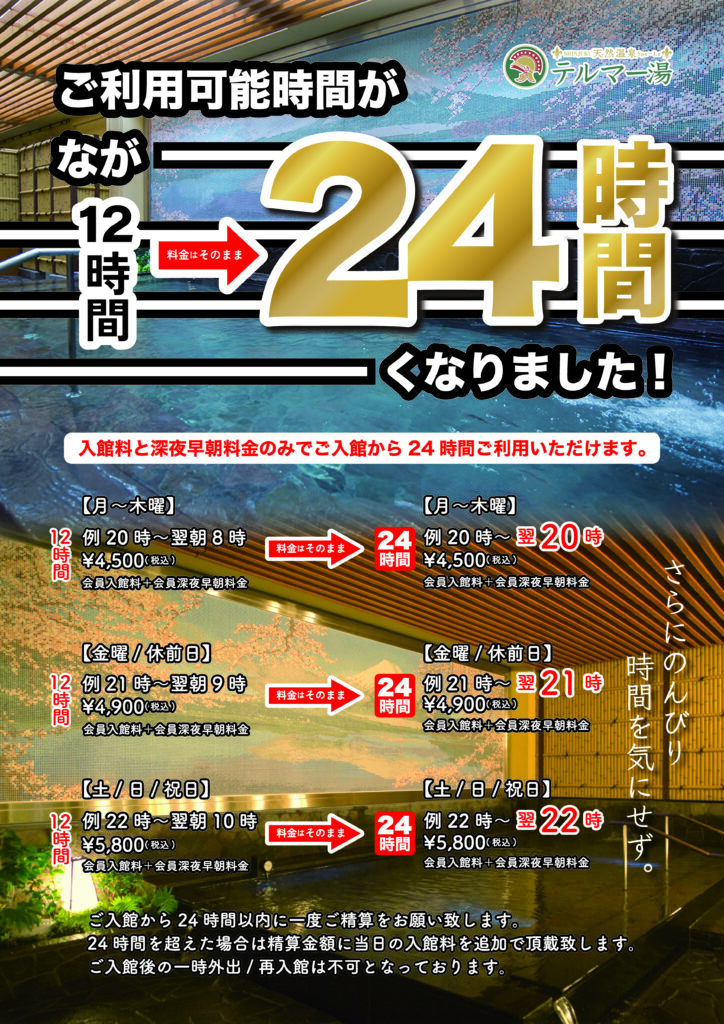 ・入館料と深夜早朝料金のみで最大24時間ご利用いただけます。
