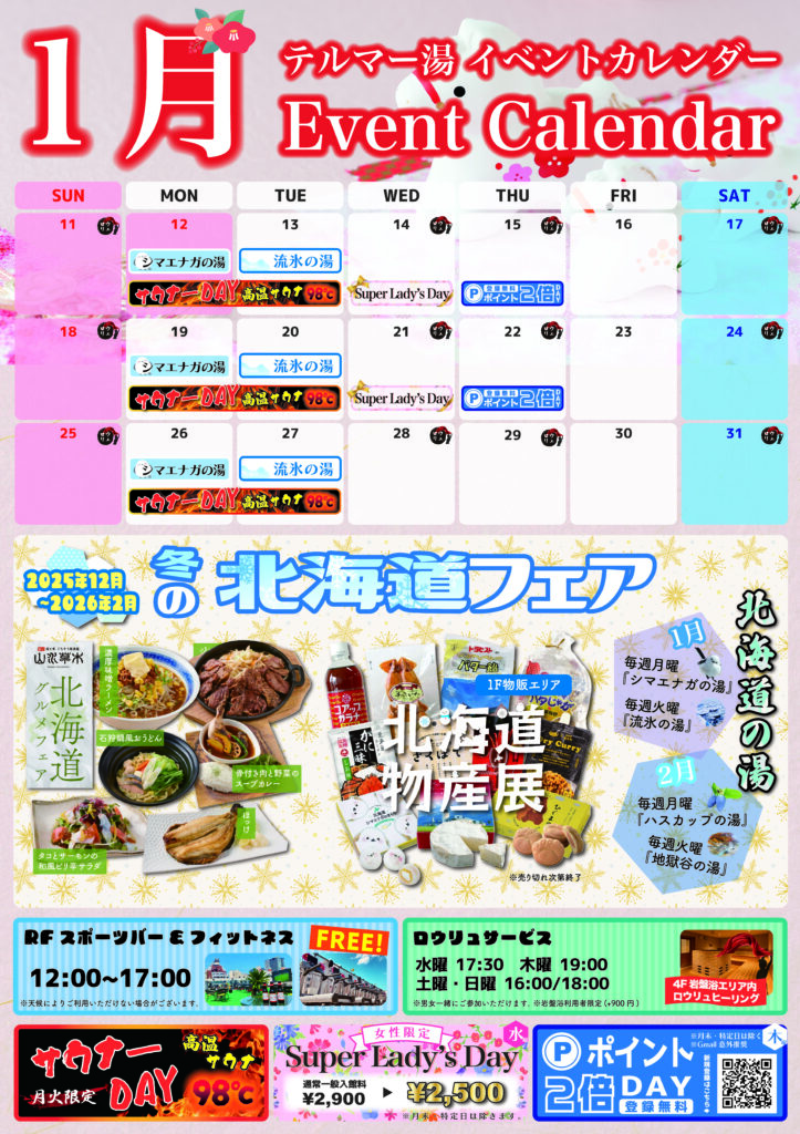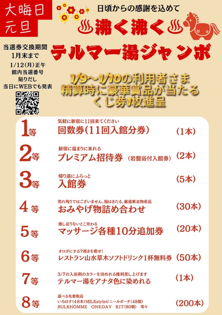 日頃よりテルマー湯をご利用いただきありがとうございます。 年末年始に開催予定をしておりました「テルマー湯ジャンボ」ですが 当館の都合で日程変更させていただきます。 大変申し訳ございませんがご了承をお願いいたします。 【抽選券配布日】 2026/1/9...